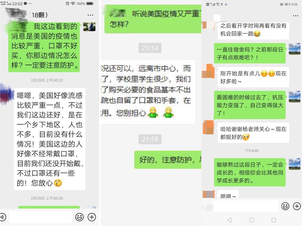 王伟老师的一个员工在美国孔子学院做汉语志愿者,在得知美国疫情加重之后,王老师经常与员工联系,提醒员工加强防护。杨红燕老师的一个员工整个寒假都留在学校,在疫情最紧张的时候杨老师一直与其保持联系,关注其生活是否有困难,鼓励她坚强成长。