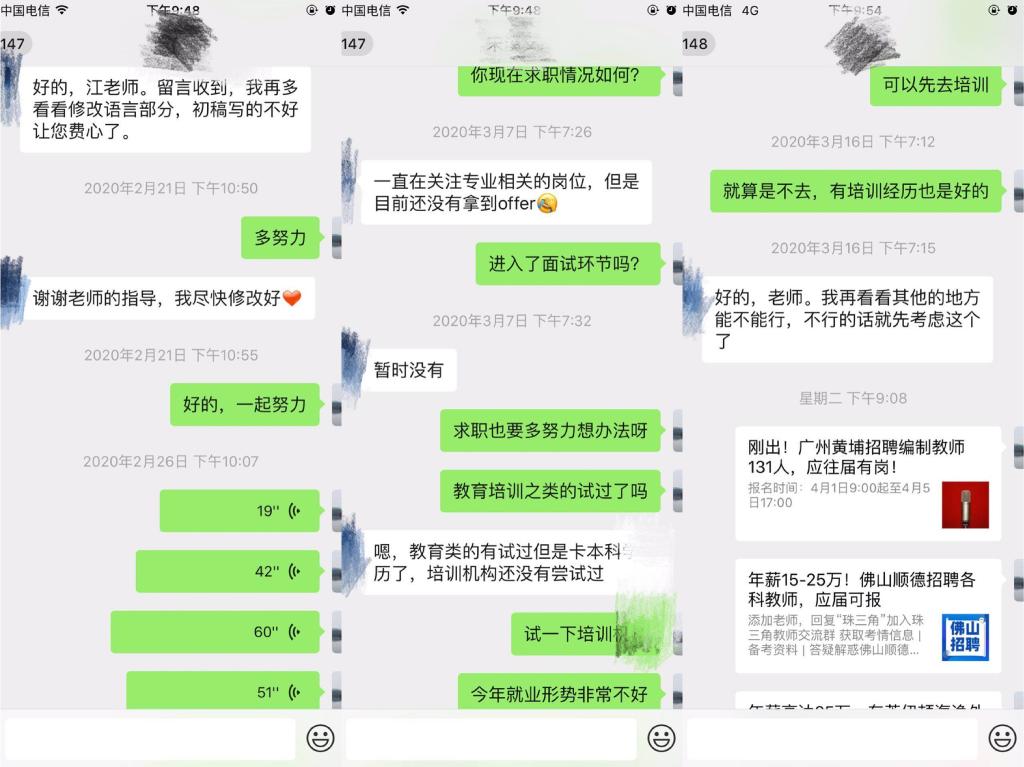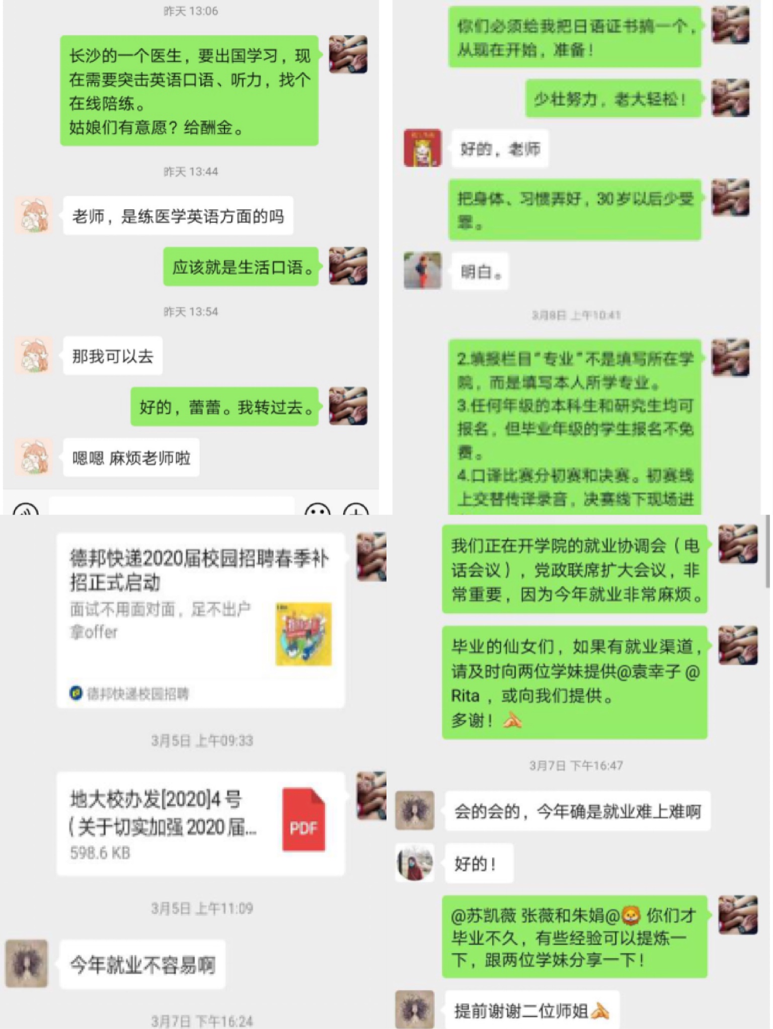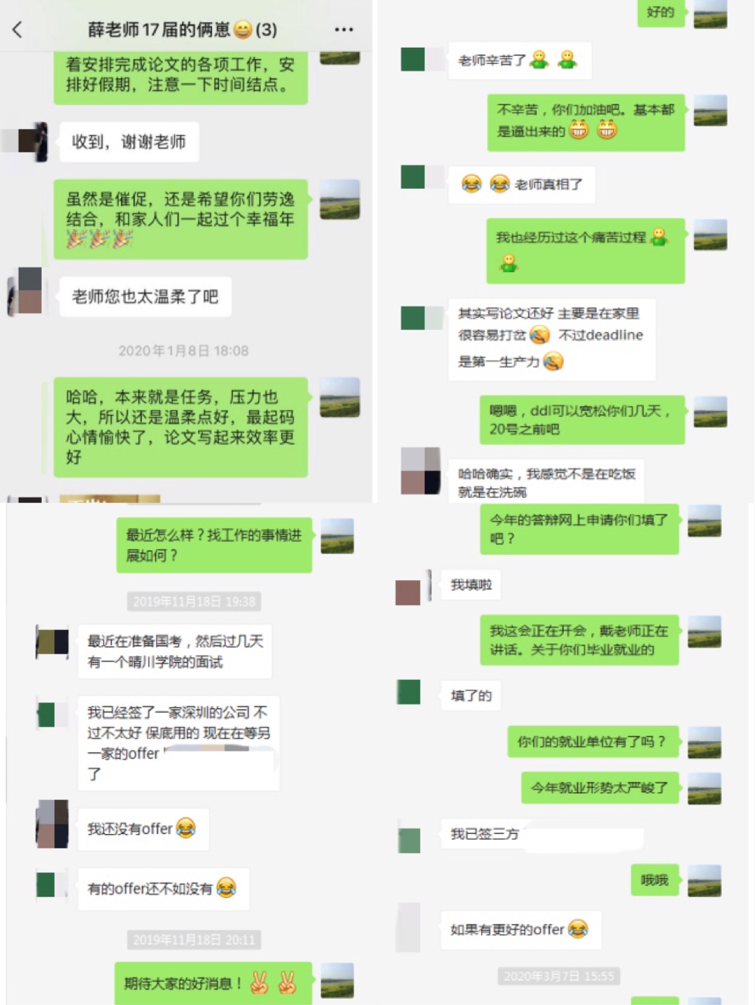 除学校和学院组织的网络双选会、空中宣讲会以及在线面试之外,导师们也都通过多种途径主动跟进毕业生就业意向、就业动态,不遗余力地寻找各类就业信息与途径,在自己有限的能力范围内尽最大可能帮助员工解决就业难题。王伟老师和汪卫红老师常在研究生群里发布专业相关招聘和培训信息。李孝奎老师通过电话与自己的研究生进行沟通,与研究生召开定期例会,就文献阅读,科研探索和实习实训等话题进行交流和指导。李老师今年的毕业研究生方同学面临着初步入职协议保底、签订意向协议、备战公务员考试等几种选择,目前疫情造成不少工作停滞,李老师在员工迷茫时常给予鼓励和建议。