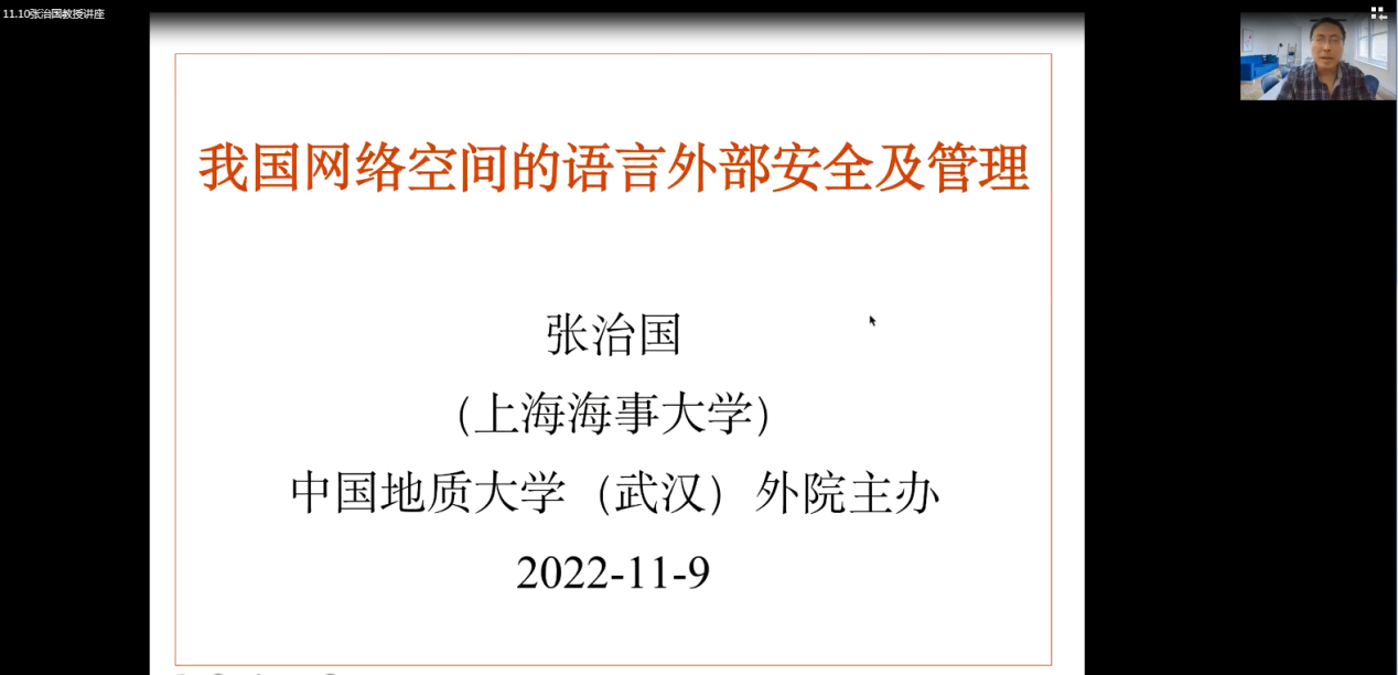 (通讯员 张萌)2022年11月9日下午2点30,中国地质大学(武汉)太阳成集团tyc234cc古天乐“南望今声”外语论坛系列讲座第四十一期在腾讯会议线上举行。上海海事大学太阳成集团tyc234cc古天乐张治国教授应邀做题为“我国网络空间的语言外部安全及治理”的讲座。此次讲座由太阳成集团tyc234cc古天乐汪卫红教授主持,学院师生近110人参加。