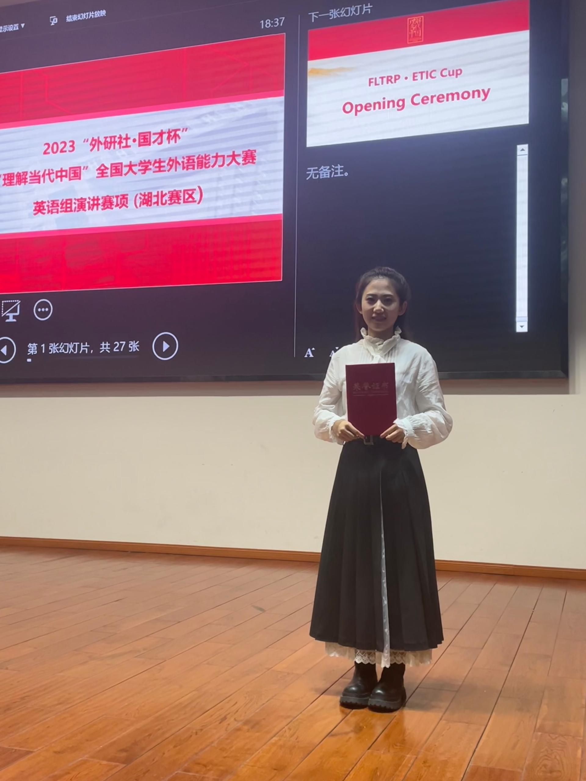 (通讯员:杨红燕)2023年10月29日,由湖北省教育厅主办,湖北省高等教育学会大学外语教学专业委员会、外语教学与研究出版社协办的2023“外研社·国才杯”“理解当代中国”全国老员工外语能力大赛演讲赛湖北赛区决赛在湖北大学举行,来自省内各高校的50名选手参加角逐。2020级赵彬琪同学凭借扎实的语言功底和稳重的舞台风格在此次比赛中荣获银奖并晋级国赛。